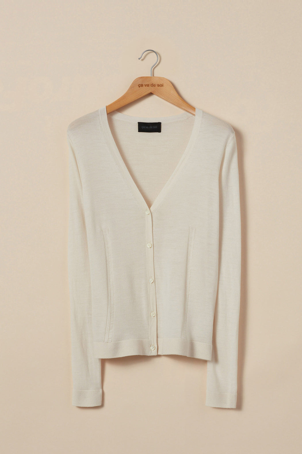 This indented, V-neck buttoned cardigan is cool, soft and elegant. Its uniqueness stems from the material from which it is made: Super 160 merino wool, a rare fibre composed of ultra-long staples whose diameter is close to 10 times finer than that of a hair. When the wool is combed, it becomes smooth, brilliant and silky, qualities coveted by ça va de soi for certain models. The technique brings to the knit a distinct elegance, opening the door to multiple combinations. Because of its thermoregulating properties, it can be worn alone, directly against the skin, or layered, across four seasons. Onyx, Nori, Ivory and Cloud: four shades, four gentle emotions.