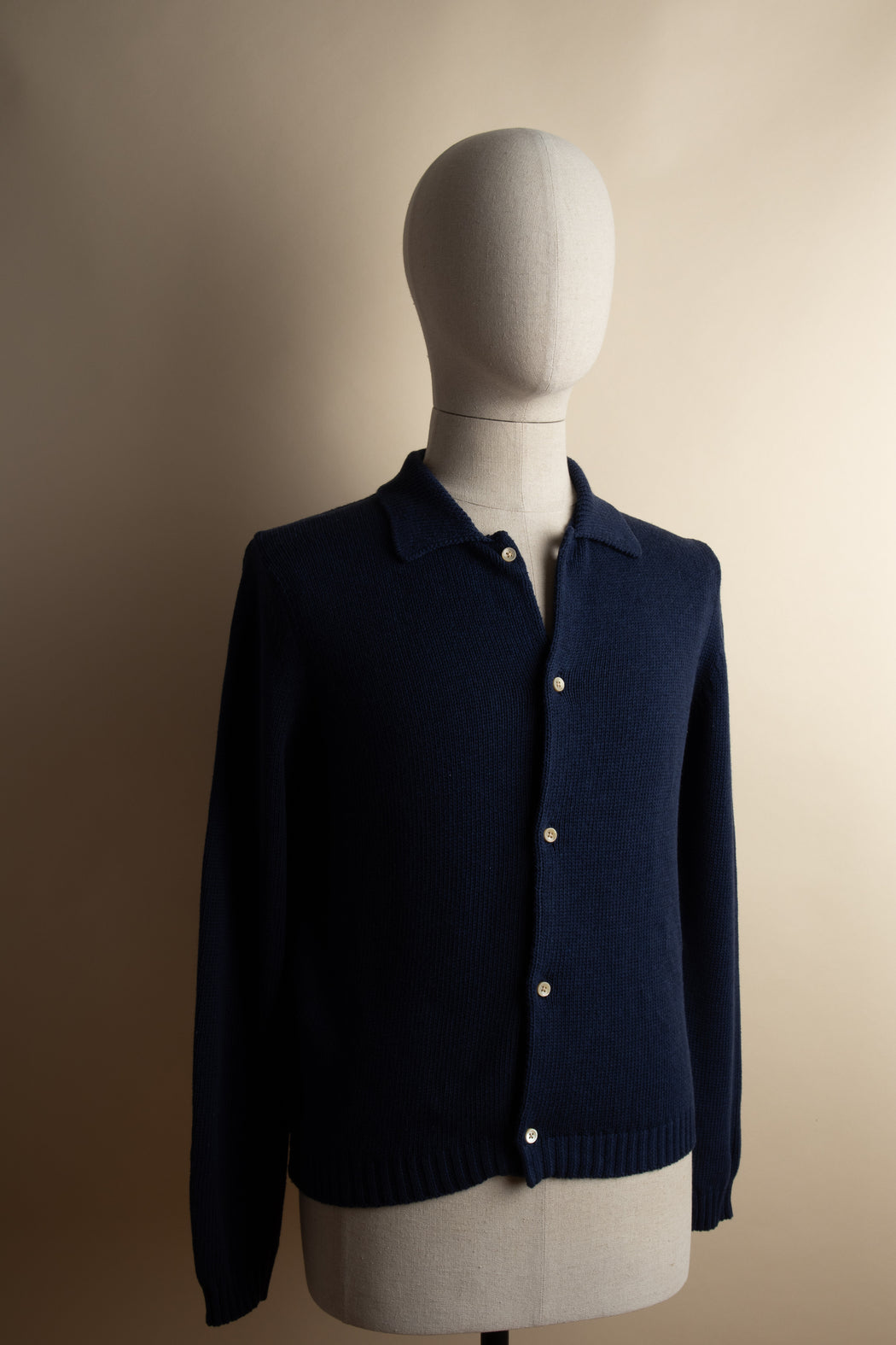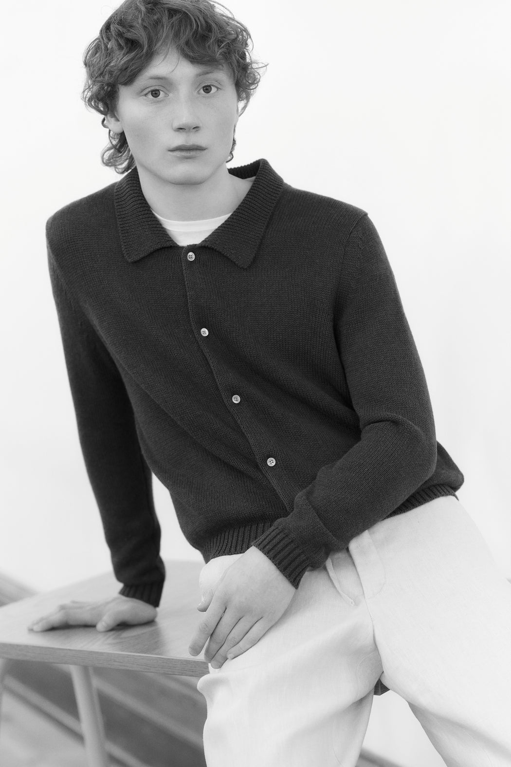 A cardigan with a very Italian spirit, inspired by the laid-back chic of the Riviera. You nonchalantly throw it on as evening falls... A straight, fairly loose cut, with ribbing at the sleeves and hem for more structure, and a polo collar that adds attitude, in a knit with beautiful density. Over a t-shirt or a shirt, cool or elegant, both work !