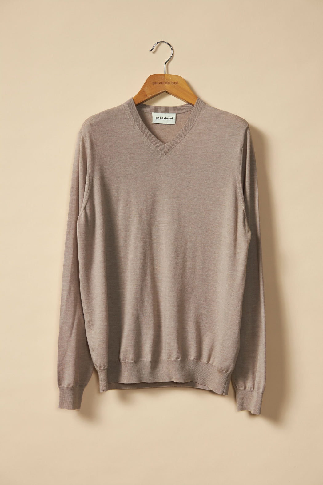 This iconic long sleeve V-neck is made of fine Super 120 extra long staples Australian merino wool. Transitional and thermal, ça va de soi uses it for its softness, lightness and freshness. The pure and modern lines of this v-neck will make you want to take it with you everywhere at all times.