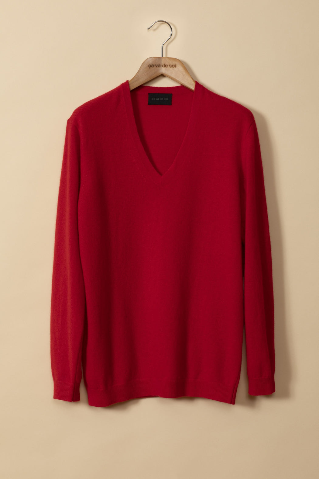 This relaxed v-neck sweater will be your best friend for the winters to come. Inspired by the classic preppy sweaters, it simply goes with everything. The lightweight carding effect and texture of this wool allow for wrapping creations in total looks composed of coats, skirts, cardigans and dresses. Made of a blend of 80% Super 100 wool and 20% cashmere for an optimal thermal effect. Its modern coloration brings along a breeze of freshness serving as tonic accents throughout the winter season like a bouquet of fresh flowers. Available in saffron, basil, mustard, and cherry.