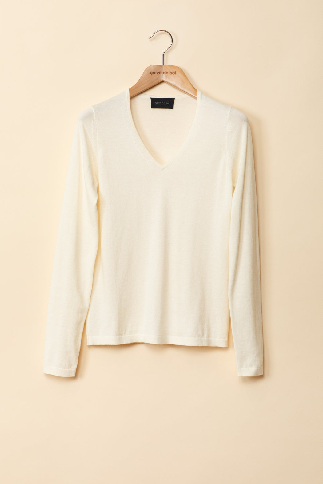 This streamlined v-neck pullover will become one of your wardrobe essentials for the years to come. Melodie can truly follow you anywhere due to its unique natural shine and effortless comfort. Made of a blend composed Giza45 is the finest high-quality cotton, long staple with fibres longer than 36mm mixed with pure cashmere sheered and combed by hand for a resistant and naturally soft yarn. The precious Giza45 mako cotton is hand picked and selected, then goes through the compact spinning process, which closes all loose fibres inside the section of the yarn, and aligned parallel for an even surface. This hard work gives a perfect even finish to the products; yarns are twisted after the dyeing process for 100% uniformity. The dyeing process, respects strict environmental norms, water is purified, tested and recycled. We produced this knit in 4 timeless hues (hank dyed by Italian masters): ivory, silver, pebble, and black.