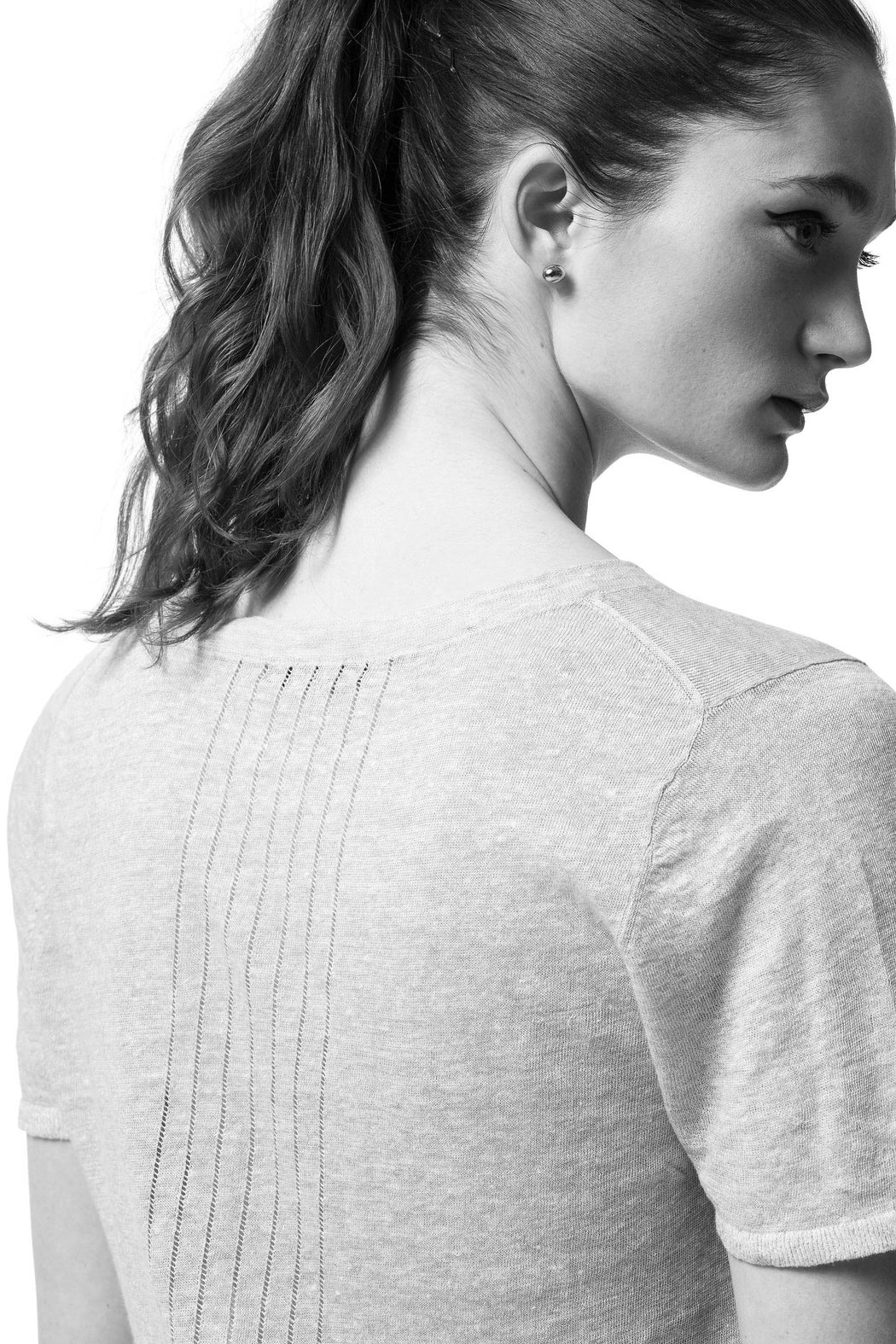 This short sleeve sweater is made of an Egyptian cotton and linen blend. The pointelle detail in the back adds breathability to the piece for hot summer days. This fibre that we call ‘the summer duo’ exudes comfort and elegance in the warmest, most humid of temperatures. The combination of fibres naturally exhibits a vintage look and is the basis of unique pieces ideal for warmer weather. The linen has an unmatched ability to absorb moisture.