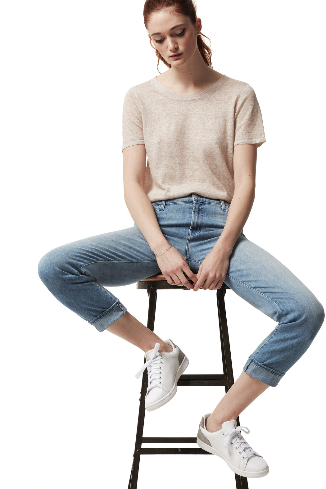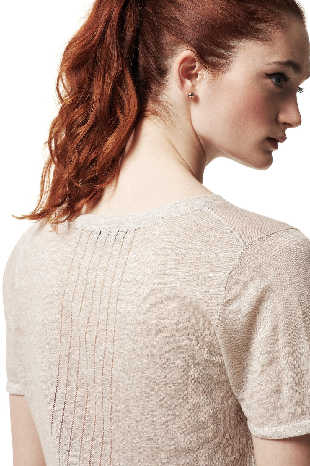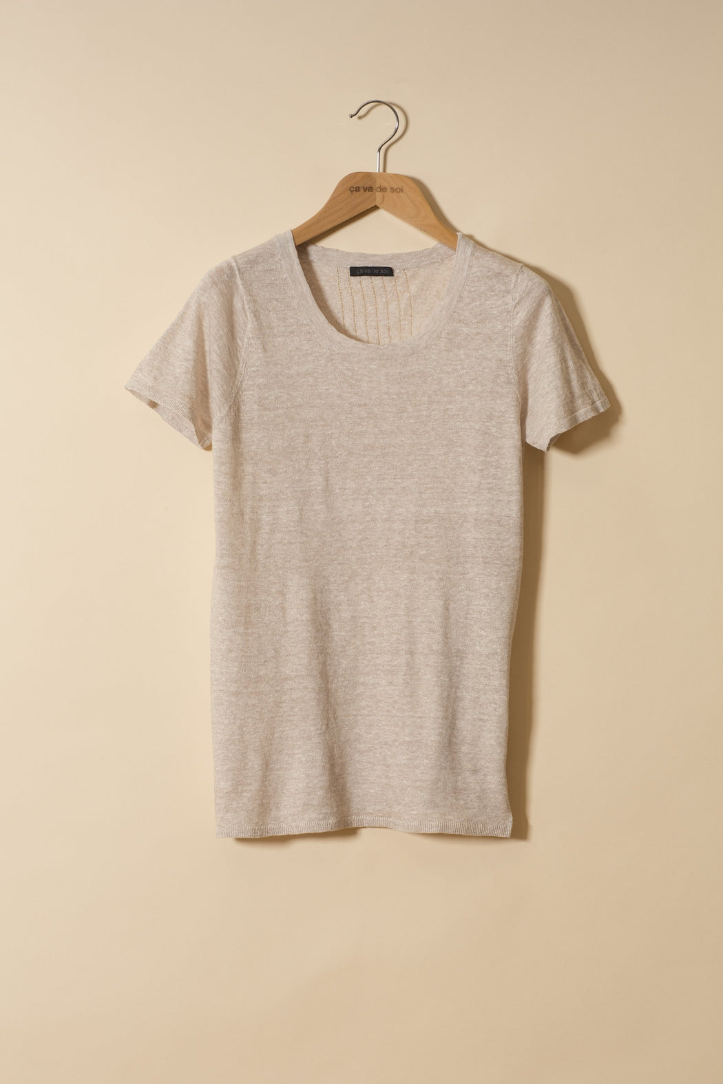 This short sleeve sweater is made of an Egyptian cotton and linen blend. The pointelle detail in the back adds breathability to the piece for hot summer days. This fibre that we call ‘the summer duo’ exudes comfort and elegance in the warmest, most humid of temperatures. The combination of fibres naturally exhibits a vintage look and is the basis of unique pieces ideal for warmer weather. The linen has an unmatched ability to absorb moisture.