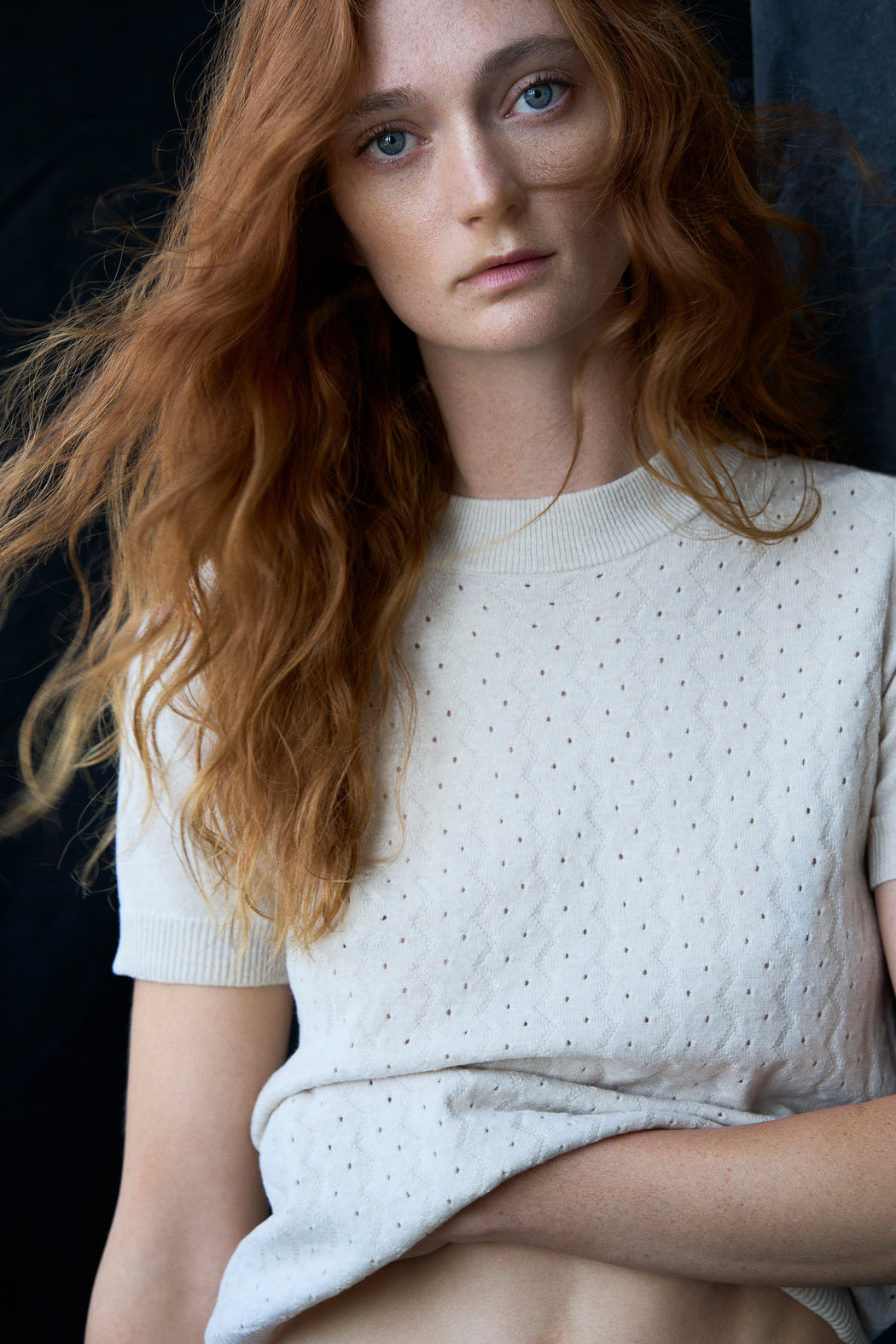 Eleanor is a gem of femininity, defined by its lace-like openwork and geometric motifs. The half mock-neck provides just the right amount of warmth. Worn with tailored trousers at work, or with boyfriend jeans for a casual twist, it’s equally lovely under the CORNELIA cardigan for a more preppy look.