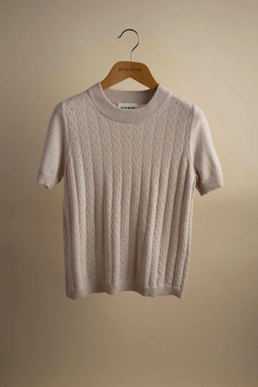 Knitted in carded merino wool, spun expressly in Italy for ça va de soi, whose extrafine (15.5-micron) and ultra-long fibre (a guarantee of longevity and beauty) gives the impression of wearing a cozy cloud — an emotional and intelligent material that understands one’s body language.