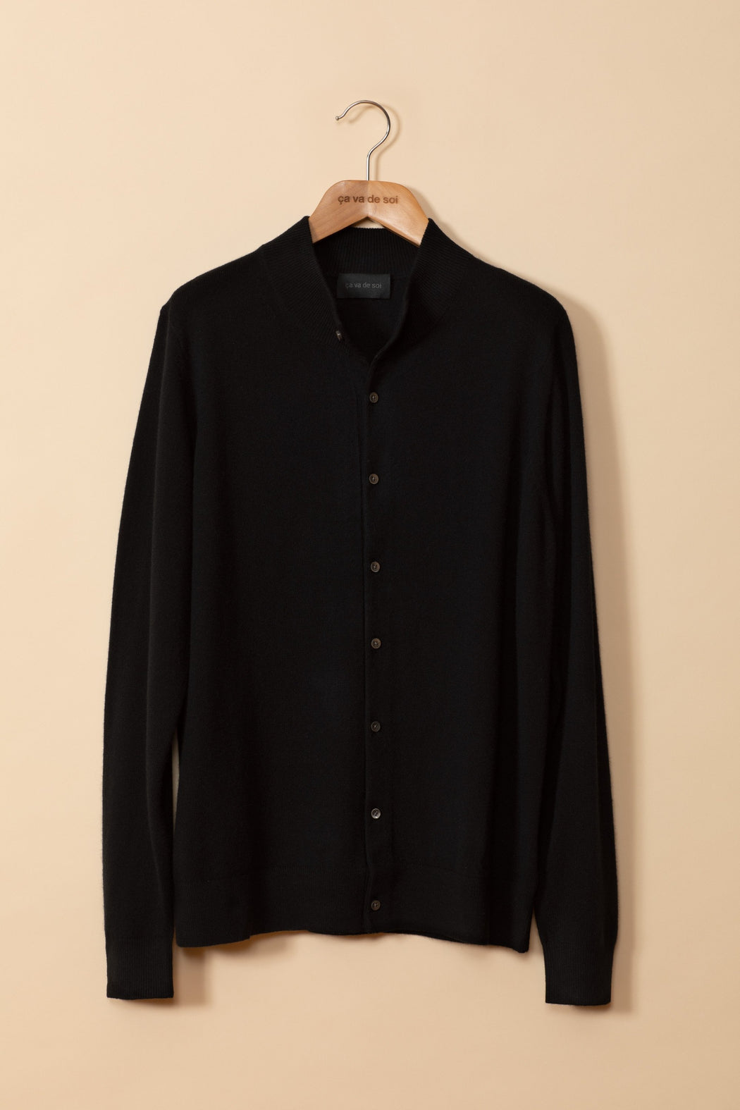 This high neck knitted jacket made of a fine blend of virgin wool, cashmere and silk is a must. It can become a blazer worn over a shirt and tie or be more sportive on a t-shirt - a passe-partout and best travelling partner. Its carded fabric composed of 60% super 100 wool, 20% cashmere and 20% silk is the ideal blend for a transitionnel period bringing comfort along with style and Its thermal properties act directly on the self confidence of the wearer – wool preserves the body’s heat, while cashmere brings warmth and silk gets in the game to strengthen, and lighten while bringing a sheen . Our research and development led us to choose this yarn this season for a men s collection. This yarn meets the criterias of the dynamic and elegant ça va de soi man by offering him sweaters of an ideal weight – just thick enough to be worn on their own and fine enough to go under a jacket. Oskar will feel cool and warm when you need it, and above all, durable and easy to care for. Available in sea lion, jeans mélange, grizzli, and black.