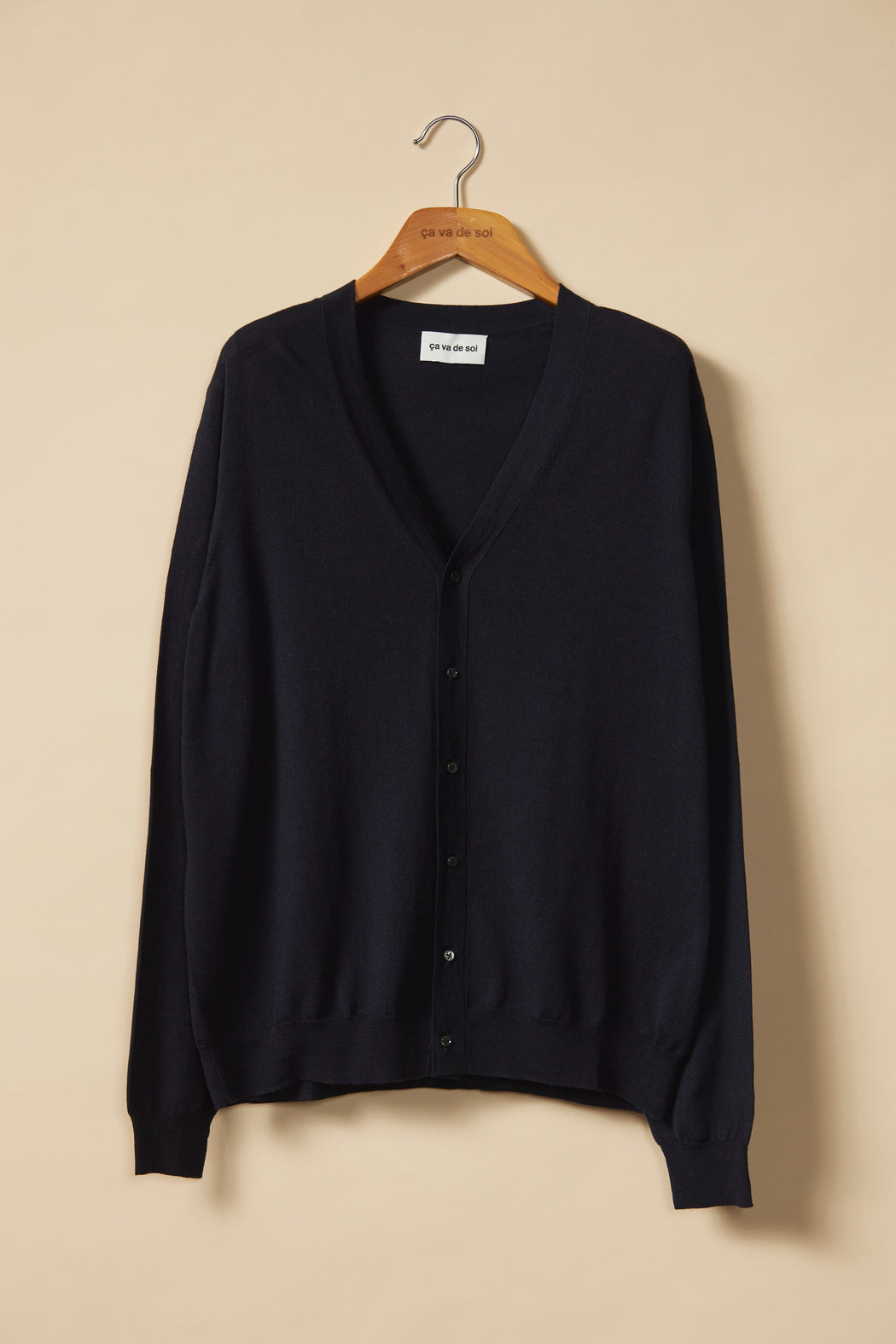 This iconic V-neck cardigan is made of fine Super 120 extra-long staples merino wool. Transitional and thermal, ça va de soi uses it for its softness, lightness and freshness. The pure and modern lines of this V-neck cardigan will make you want to take it with you everywhere at all times. May be worn directly on the skin, over a t-shirt or a shirt.