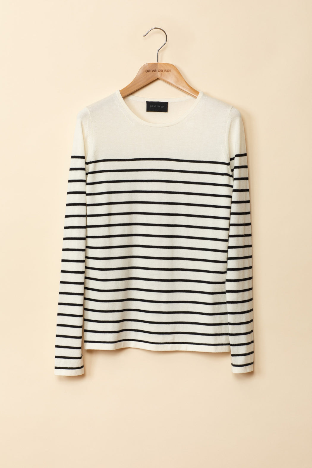This fine stripe crewneck pullover will become one of your wardrobe essentials for the years to come. Serenade can truly follow you anywhere due to its unique natural shine and effortless comfort. Made of a blend composed Giza45 is the finest high-quality cotton, long staple with fibres longer than 36mm mixed with pure cashmere sheered and combed by hand for a resistant and naturally soft yarn. The precious Giza45 mako cotton is hand picked and selected, then goes through the compact spinning process, which closes all loose fibres inside the section of the yarn, and aligned parallel for an even surface. This hard work gives a perfect even finish to the products; yarns are twisted after the dyeing process for 100% uniformity. The dyeing process, respects strict environmental norms, water is purified, tested and recycled. We produced this knit in 3 timeless combos (hank dyed by Italian masters): ivory-black, ivory-silver, and ivory-pebble.