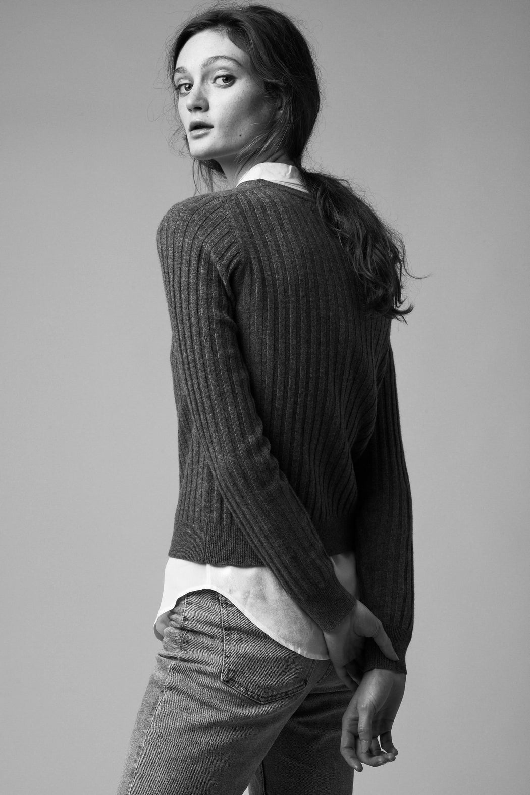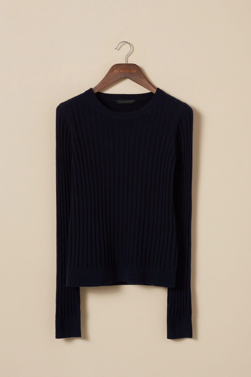 "Nothing is lost, nothing is created, everything is transformed," once said Lavoisier. Indeniably contemporary, this wide-ribbed little sweater, which takes its own spin on the vertical stripe, echoes the style of actresses of the 1960s. To be worn everywhere and with everything, this essential sweater little sweater swiftly makes the perfect sweater list. An interesting mixture of European chic and that famous American casual, its charm comes from its shape, colour and material. A rare and desirable Super 160 merino carded knit. Black, Sapphire, Caviar or Pearl… all these colours win the gold.