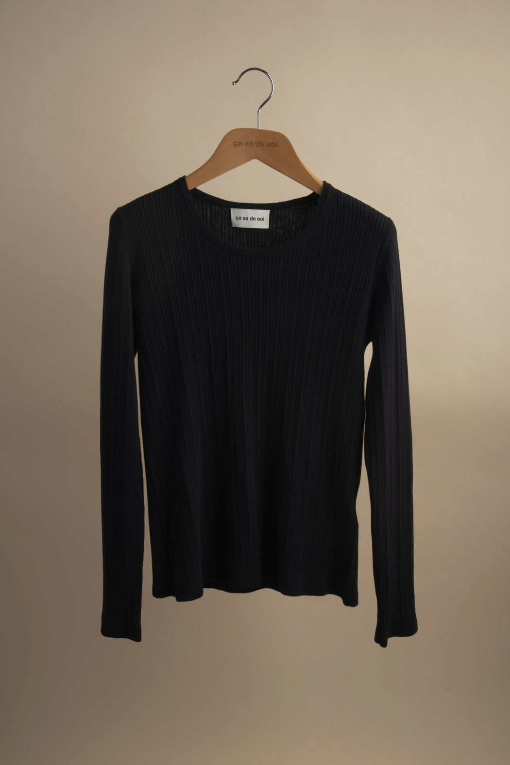 Here is the crewneck version of this iconic 1970s piece, whose charm lies in the rhythmic play of its ribs, like music, knitted with care—ça va de soi. Highly feminine with slim-fit jeans, its ribs accentuate your curves beautifully while offering unmatched comfort and elasticity.