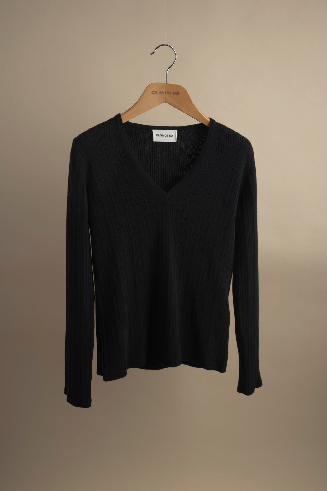 An iconic 1970s piece, this V-neck sweater finds its charm in the rhythmic play of its ribs, like music, knitted with care—ça va de soi. Highly feminine with slim-fit jeans, its ribs accentuate your curves gracefully while promising incomparable comfort thanks to their natural elasticity.