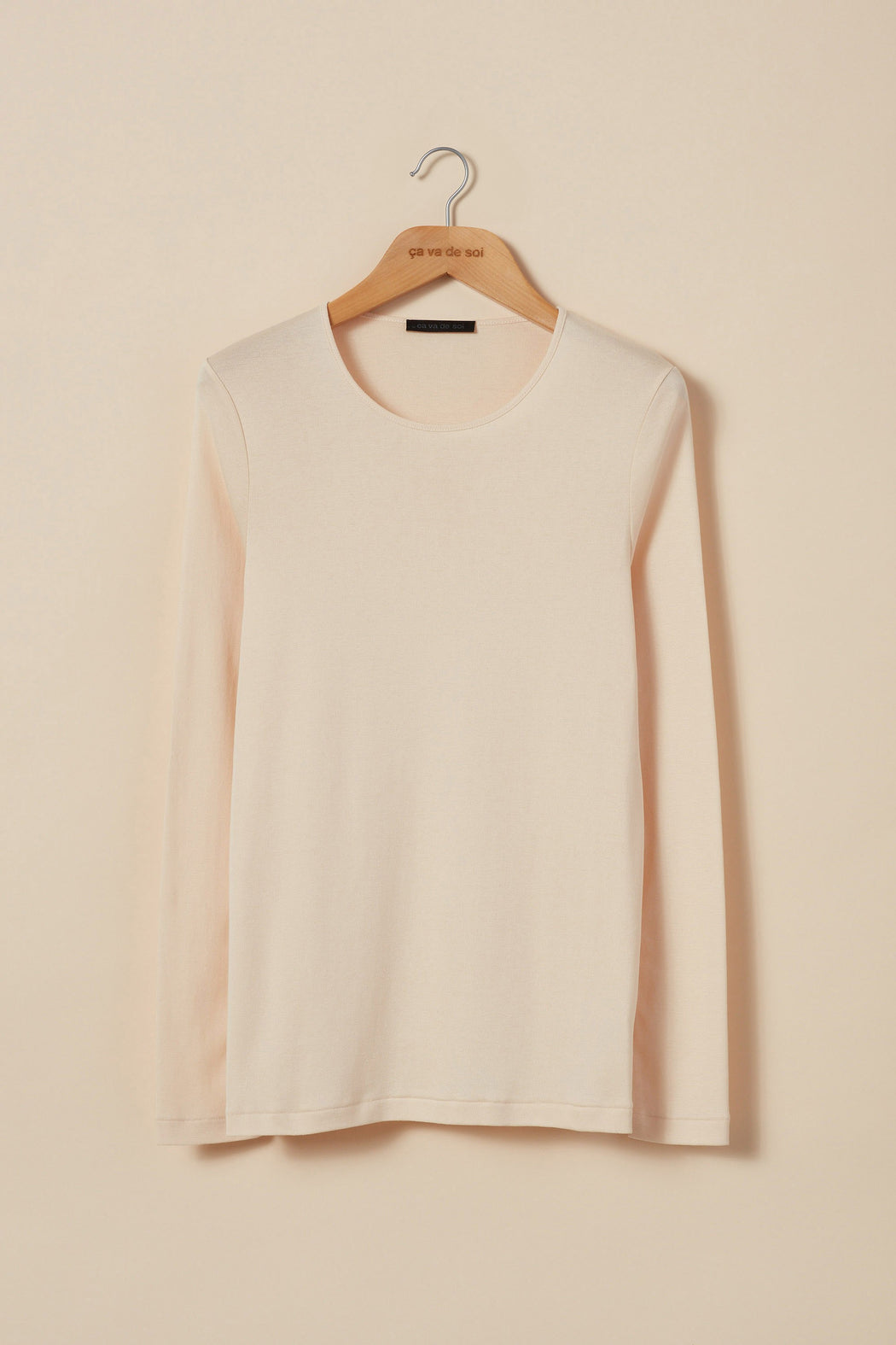 Pour mesurer le plein potentiel du confort rarissime que peut générer le coton égyptien Karnak-Menoufi, c’est simple, il faut l’enfiler sans interférence, tout contre la peau ! Ce classique à manches longues et au col ras-du-cou est le vêtement quatre saisons dont on ne peut que rarement se passer. On le savoure en duo sous une laine l’hiver, puis en solo quand le temps est chaud. Cette aise à le porter dépend essentiellement de la matière, mais elle est habilement secondée par sa forme fluide et légère dont les coutures recouvertes à partir du même coton ajoutent au bonheur épidermique. La collection de cet essentiel se décline en trois nuances claires et en un noir Réglisse.