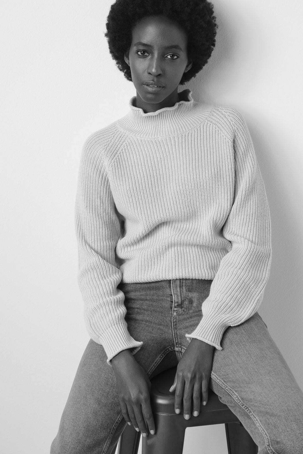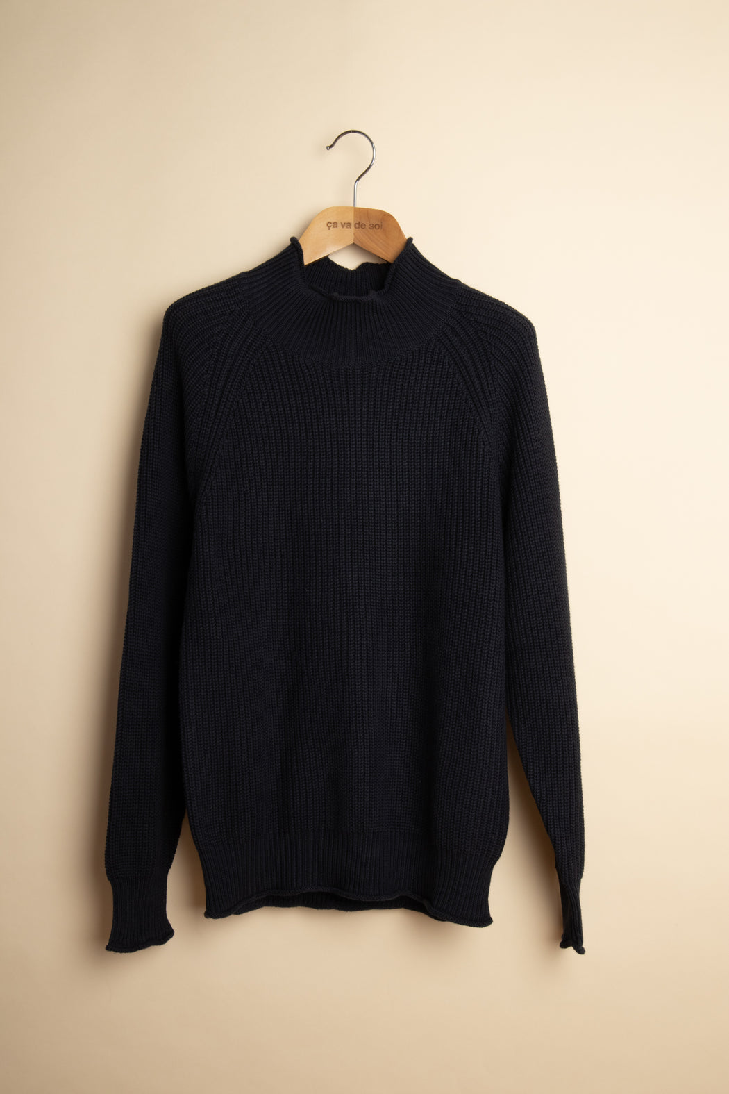 This fancy jumper with a funnel neck and English rib knit is inspired by the fishermen sweaters of the English seas. It stands out for the refined finish of the rolled collar, cuffs and opening. Cozy yet artsy, even a little punk twist depending on your mood...