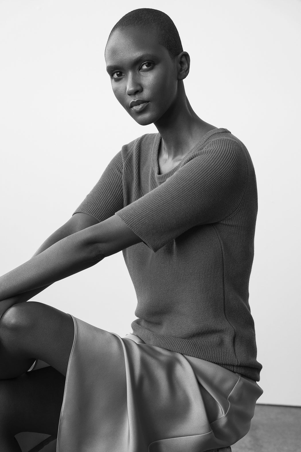 Crewneck sweater whose unusual length from the sleeves to the elbows guarantees sophistication and allure. Its slightly loose fit gives it a casual look.