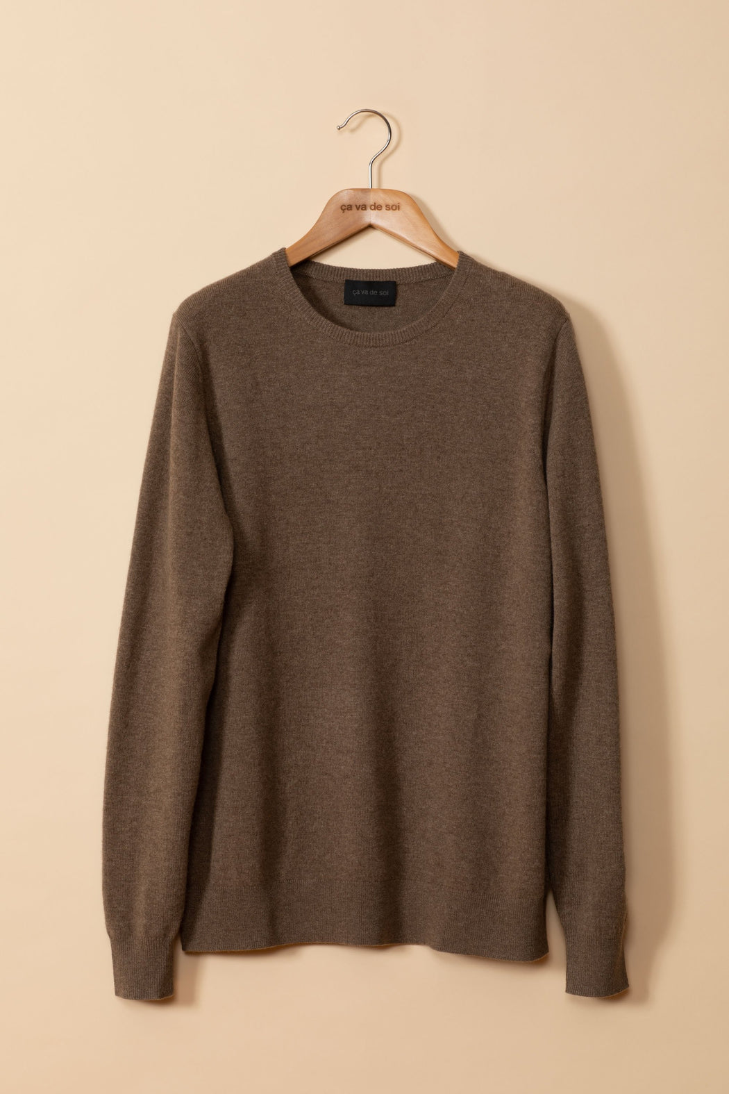 This so classic functional Crew neck is a must in a wardrobe to be collected in al colors. Made with 60% mérinos, 20% cashmere and 20% silk, it will keep you warm in comfort and élégance. Its carded fabric composed of 60% super 100 wool, 20% cashmere and 20% silk is the ideal blend for mid-seasons and winter, bringing comfort along with style. Wool preserves the body’s heat, while cashmere brings warmth and silk gets in the game to strenghten, and lighten while bringing a sheen. Our research and development led us to choose this yarn this season for a men s collection. This yarn meets the criterias of the dynamic and elegant ça va de soi man by offering him sweaters of an ideal weight – just thick enough to be worn on their own and fine enough to go under a jacket. Miles will feel cool and warm when you need it, and above all, durable and easy to care for. Available in sea lion, jeans mélange, grizzli, and black.