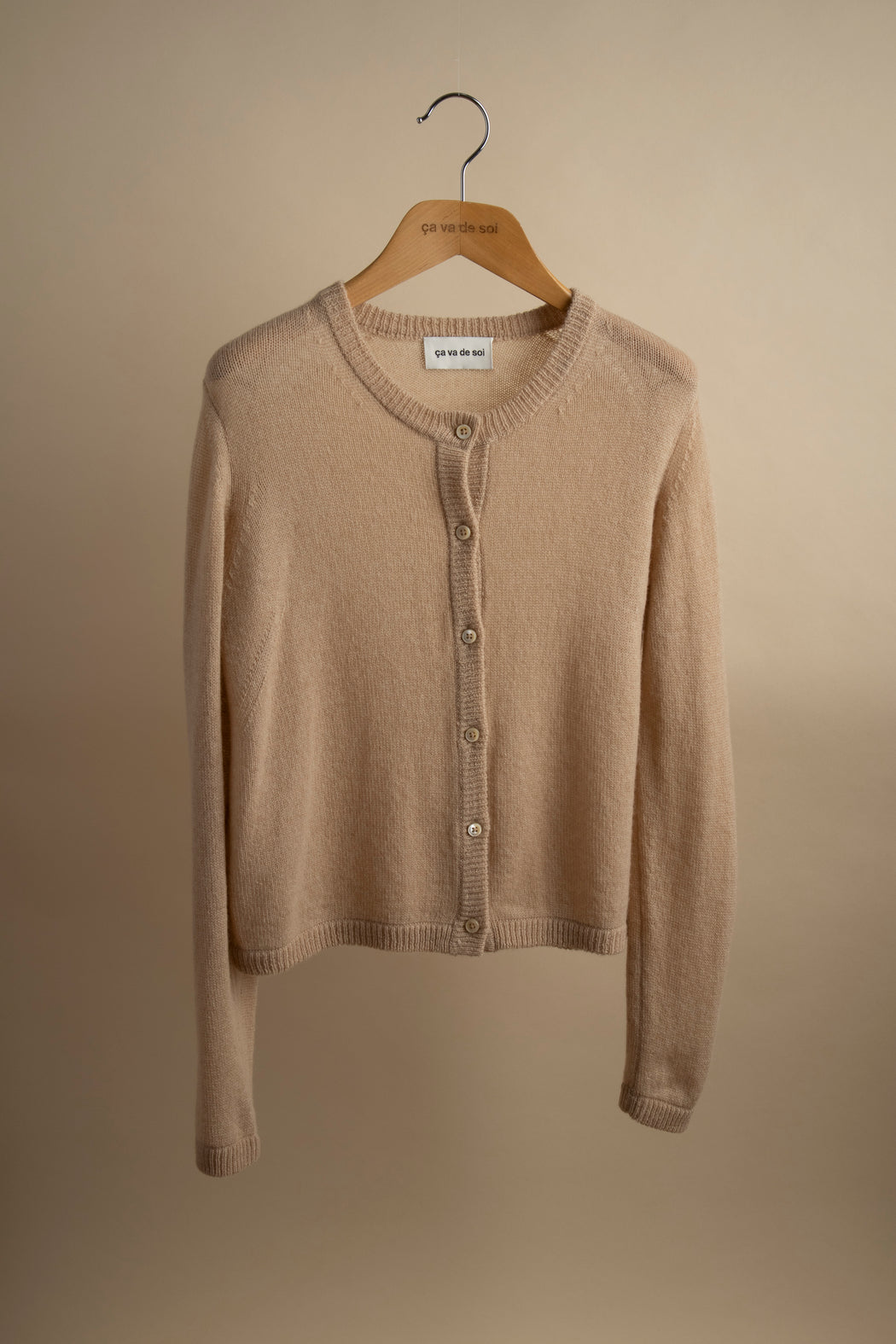 A timeless wardrobe classic with undeniable charm. Barlim is a cardigan with mother-of-pearl buttons on ribbed placket, creating a subtle play of textured knits. Perfect worn with our sleeveless top, OROG.