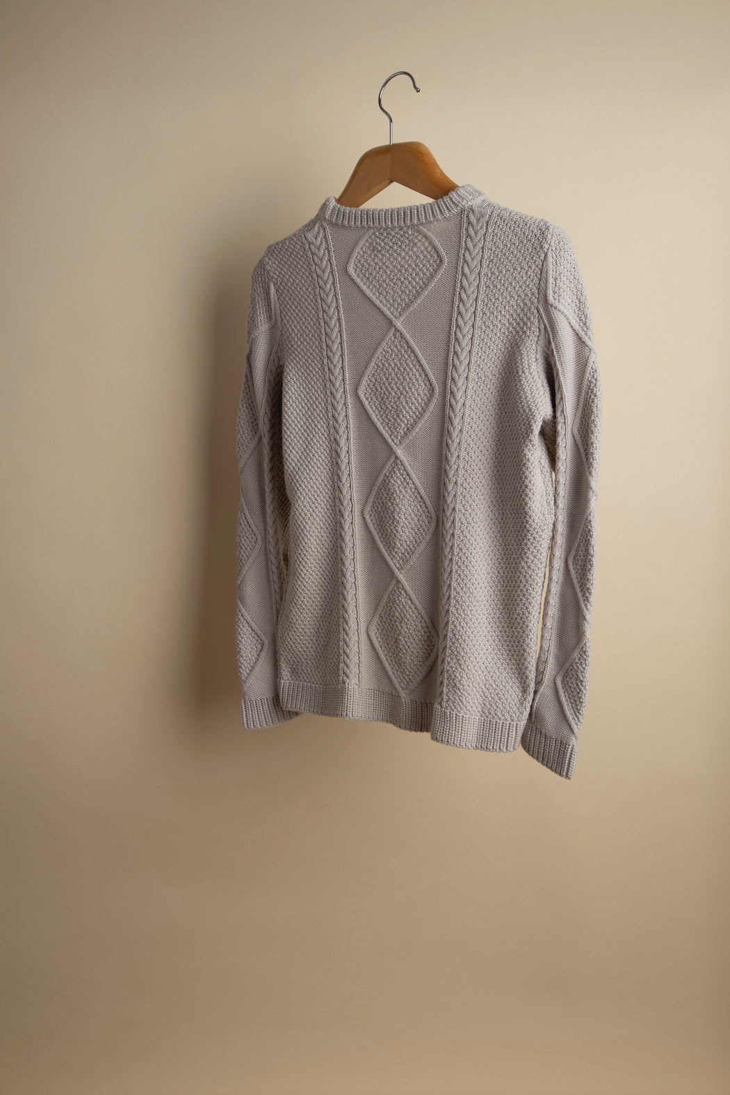 An Aran sweater can easily take 40 to 60 hours to make. Ours is knitted with a double gassed thread of Egyptian cotton for lasting softness and a cosy feel. It is produced on a hand operated machine, where every technician develops his own unique technique to produce the cable and texture variations.
