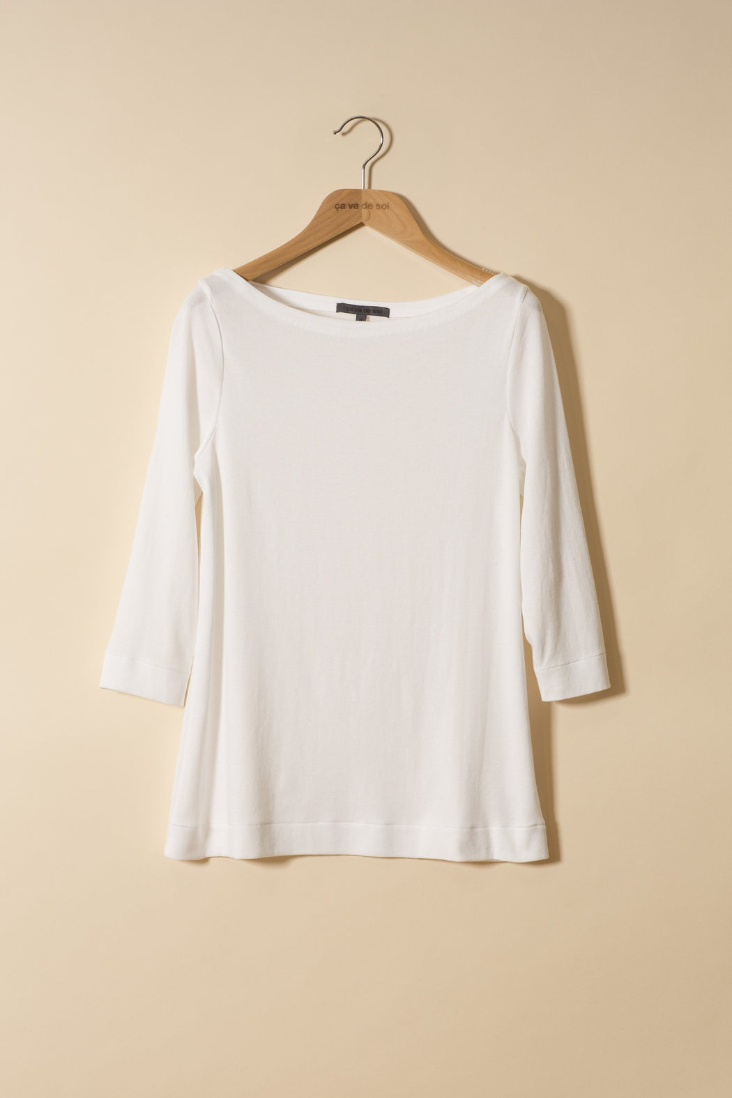 Ce t-shirt col bateau est fait d’un coton mako Giza 87 d’Égypte ultra-fin tellement fabuleux qu’il appartient à un mythe. Cultivé sans produits chimiques et cueilli à la main sur les rives du Nile, ce Giza 87 est rare et connu pour sa brillance et sa douceur. Il se vend aux enchères ou il atteint des sommets comparables au cachemire et aux laines les plus recherchées. Pour ça va de soi , il devient inspiration de collections classiques épurées, deuxième peau, d’un naturel soyeux et caressant rarissime.