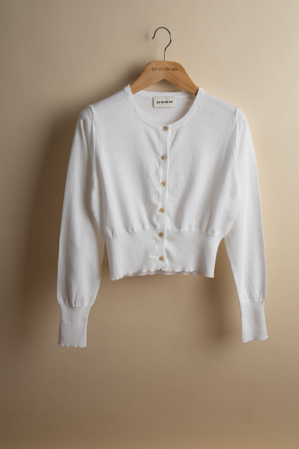 Le cardigan Guinguette est la preuve que le style et le confort peuvent s'allier, toujours pour vous mettre en valeur. Il est charmant, avec sa patte de boutonnage en tubulaire et ses larges bords-côtes resserrés au bas et aux manches, qui souligneront avec raffinement la taille et les poignets. Une nouvelle approche du boléro, en version plus contemporaine.